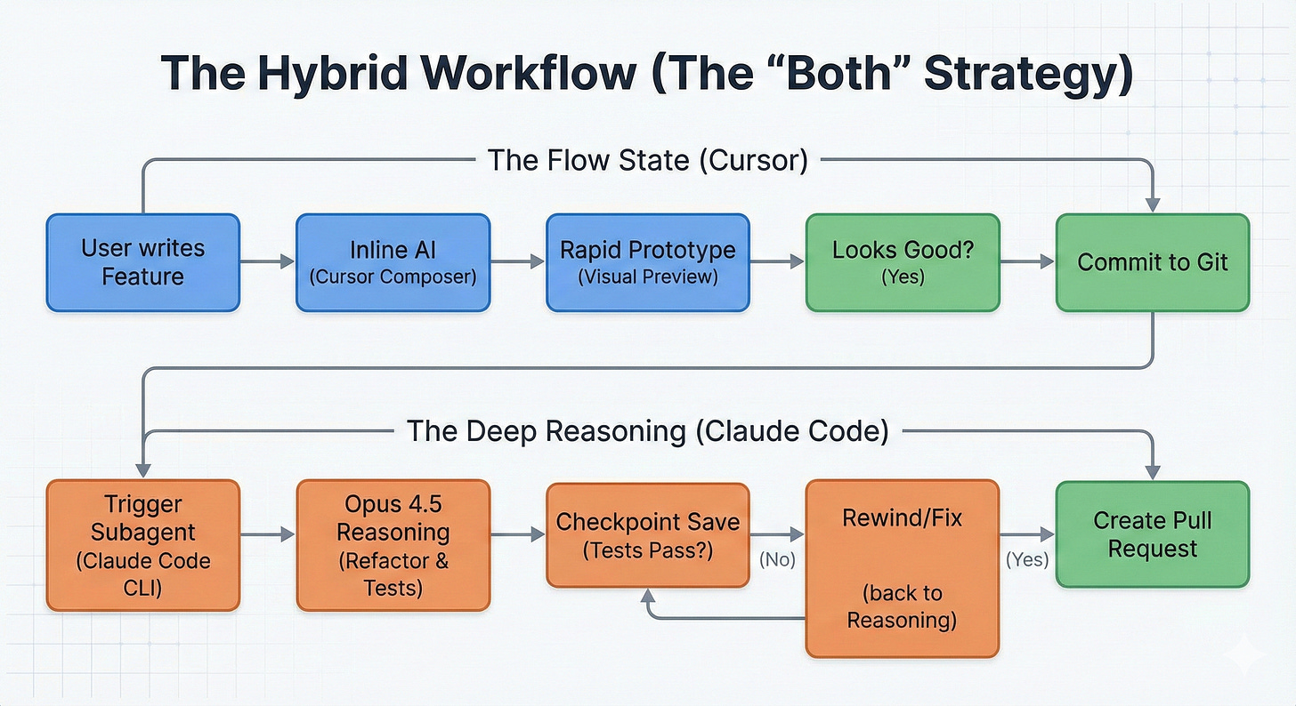 You can code in Cursor with quick inline completions. Meanwhile, Claude Code refactors your old authentication module in the terminal. This isn’t hypothetical, it’s the hybrid approach in action.